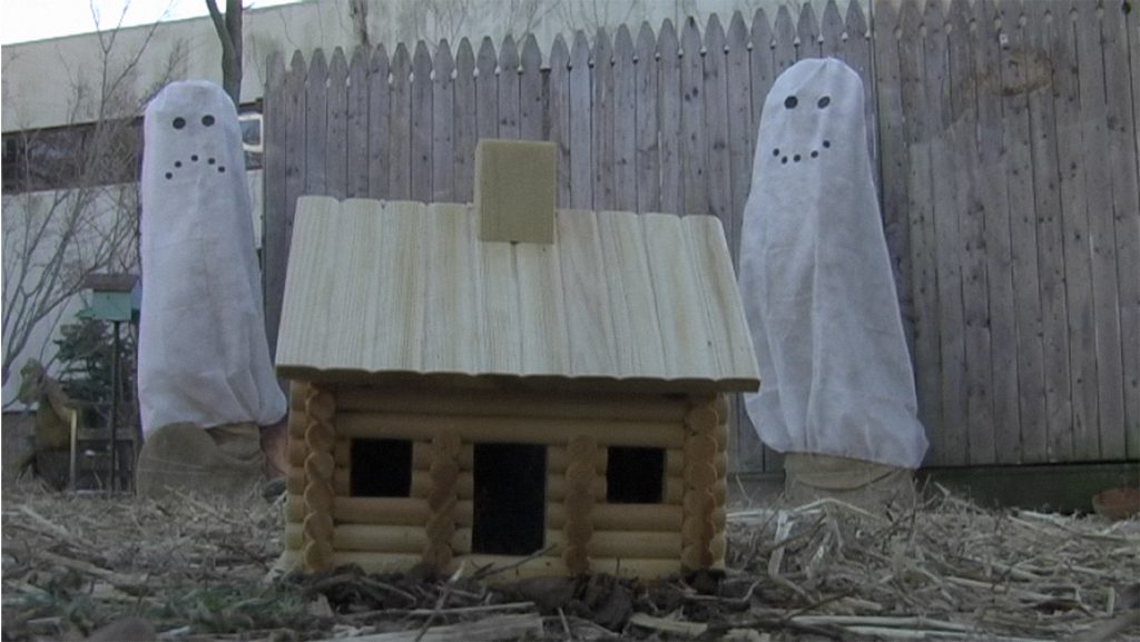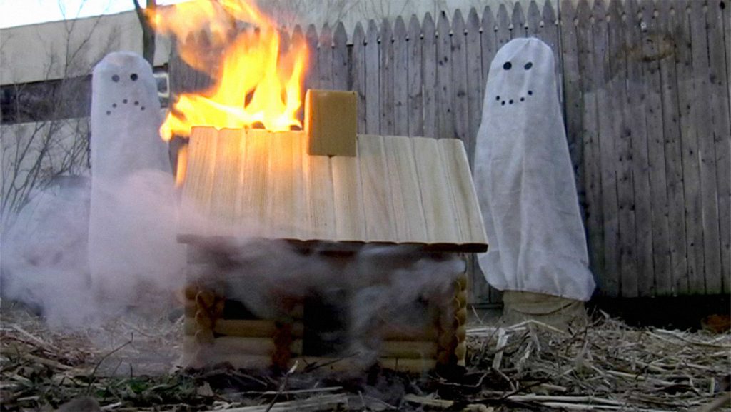 In the works, ghosts are often presented as material objects. For instance, consider the two ghosts in our home (2013). I made the ghosts first, and the house was an afterthought that occurred while buying glitter at Michaels. They needed something to haunt, of course, and the moment I saw the miniature house, I knew I wanted to burn it to the ground while the ghosts watched.