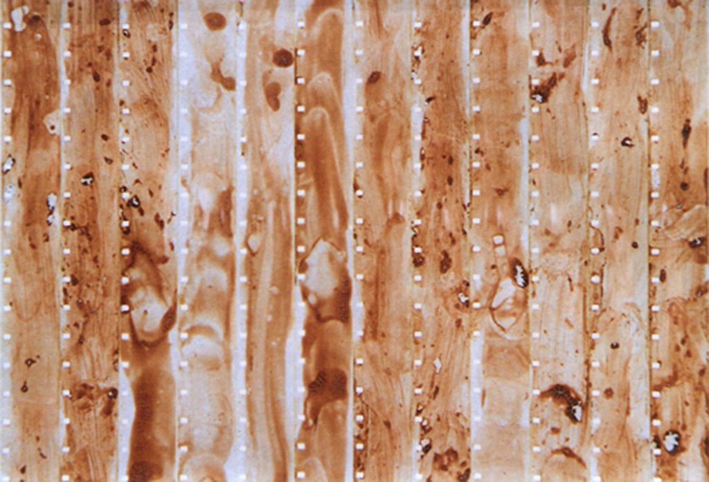 TF: It didn’t take that much blood, maybe like 0.05 litres. For the first few meters of film, I used blood collected from nosebleeds. I really liked the results. When that blood was gone I obtained three vials taken with a syringe from a nurse. I never intended to screen the original. I projected it at home to see what it would look like; after that, it was viewed only on a flatbed editor. Blood always ended up coming off. When it screened at Ann Arbor in 2000, I made business cards that included pieces from the original film strip. I only have a few left. In general, I think the colour has become a bit weaker and maybe a bit more yellow or brown, too.
