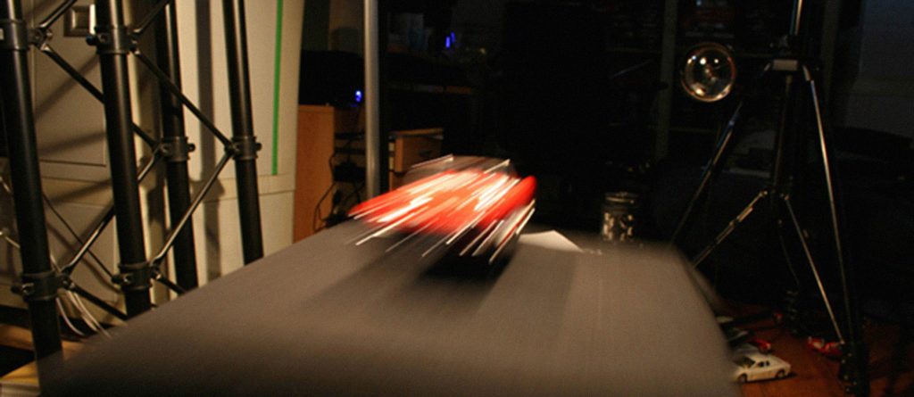 CE: I remember the first time I saw Dromosphäre. The film was completely mesmerizing. I kept trying to figure out how the images were produced ; they looked totally computer generated. I remember the stupendous dissonance I felt as you slowly revealed how the images were created using analogue means. In the time it takes the shutter to open and close, a toy car is displaced by a specific distance, thus creating the illusion of movement. E ach frame of the film represents a movement over the time. In other words, each frame of the film does not represent a specific place in time. Do you feel this film supports the idea that the experience of Now is separated from place?