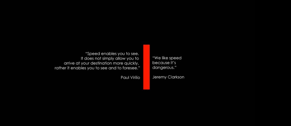 TF: It is intended to be a bit tongue-in-cheek. I wanted to contrast the academic world with pop culture. One is potentially complicated and the other is inherently easy to grasp but also totally generalizing. This is how the world works, as one can see in the political realm. The popular solutions are always the simplified ones, a result of black-and-white thinking. The general idea was to juxtapose two contrasting perspectives on speed. Neither represents my view on the topic. I’m not much of a philosopher nor am I into generalizations. However, I do enjoy reading Virilio and watching Top Gear, the BBC series that features Clarkson.