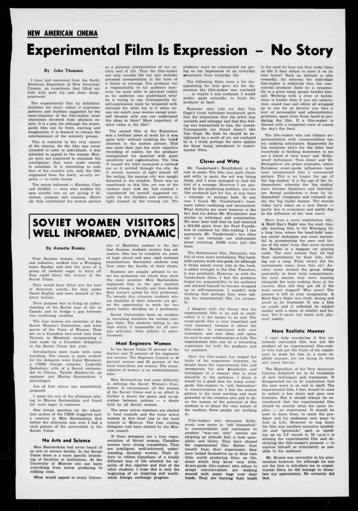 John Thompson, “New American Cinema: Experimental Film Is Expression – No Story,” The Manitoban (October 16, 1964): 11.