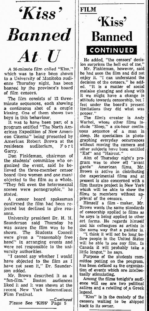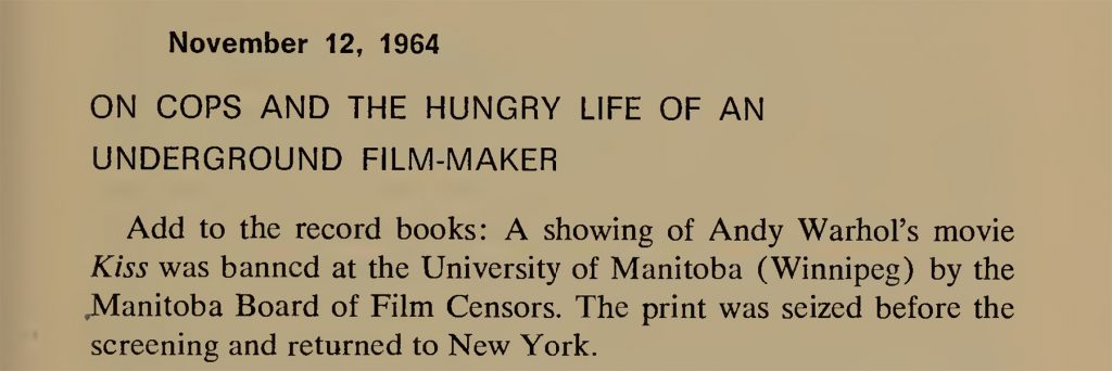 Add to the record books: A showing of Andy Warhol’s movie Kiss was banned at the University of Manitoba (Winnipeg) by the Manitoba Board of Film Censors. The print was seized before the screening and returned to New York.