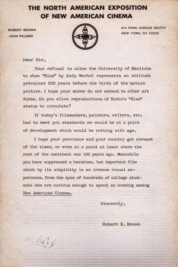 Your refusal to allow the University of Manitoba to show “Kiss” by Andy Warhol represents an attitude prevalent 200 years before the birth of the motion picture. I hope your mores do not extend to other art forms. Do you allow reproductions of Rodin’s “Kiss” statue to circulate