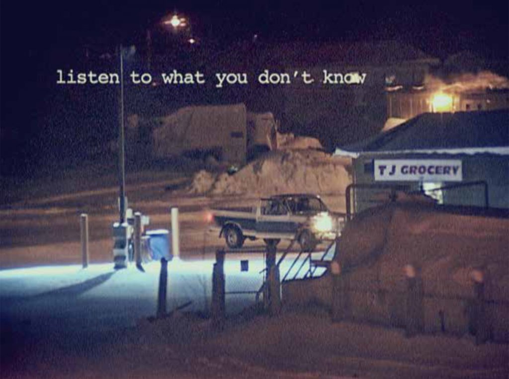 Embracing the unknown or the unfamiliar, allowing for perspectives that are different or beyond our current subjectivity. This is a space inhabited by empathy and personal growth. The video ends with a point-of-view shot of the artist walking through the middle of a snow-covered field in the middle of night. A simple question is posed.
