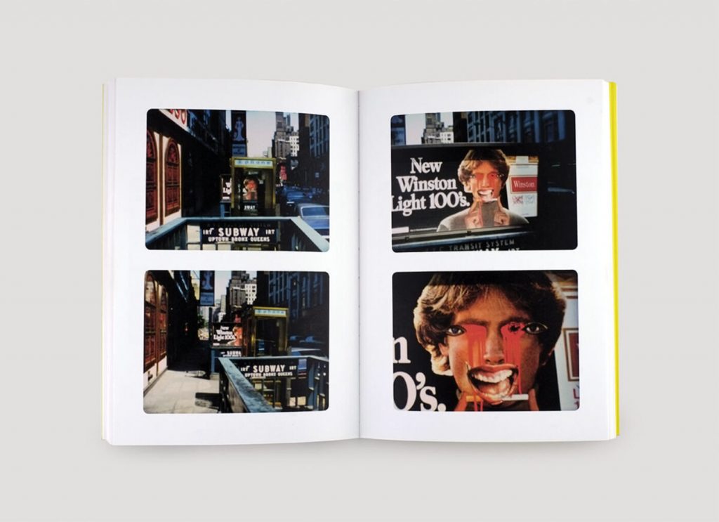 The artworks documented in ISM ISM consist primarily of large-scale cigarette advertisements with humorously deformed faces produced using collage techniques and spray-paint, and text-based works consisting of phrases that both poetically and philosophically examine subconscious desire and transcending the status quo. For instance, consider the following: “SUBCONSCIOUS DESIRE / EXPRESSES ITSELF / THROUGH GAPS / IN THE FLOW OF LANGUAGE / SLIPS OF THE TONGUE / LAPSES OF MEMORY / DREAMS / JOKES / GRAFITTI / TRANSGRESSIVE ERUPTIONS OF HUMOUR,” or “UNPLUG YOURSELF ORGASM / FROM THE MACHINE.”10 Each of these lines of text exist separately from each other but the film and the book provide a linear way of navigating them, thereby forming a cartography of the text.