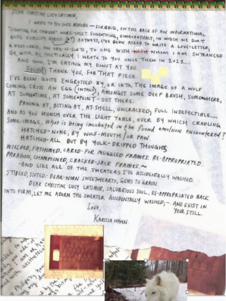 CE: Your fan letter to Canadian moving image superstar Christine Lucy Latimer is beyond charming. It is possible to see the playful spirit that informs CLL’s formal experimentation in many of your works. Have you written many of these types of fan letters?