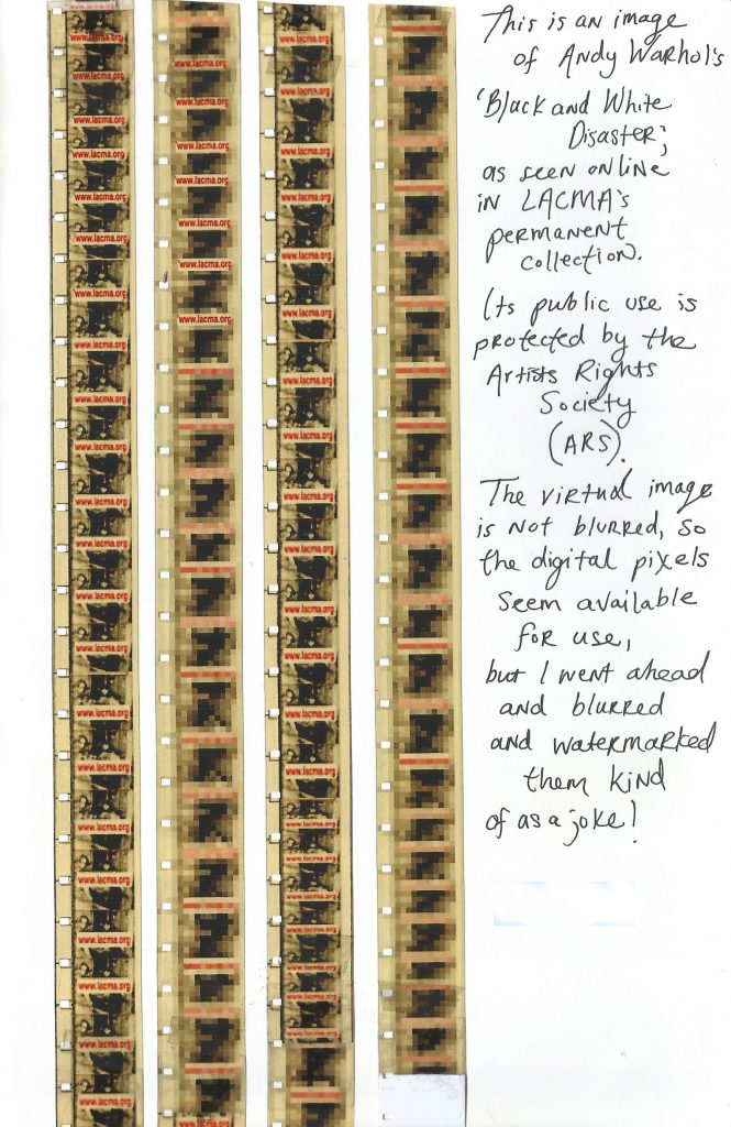 KH: I began to think about copyright, plagiarism and the censorship of images when I was working for the Internet Archive. The work is more of an investigation into the privatization of pixels than a film. While I was looking through the LACMA private collection online, I saw Andy Warhol’s Disaster Series with a watermark across it. I thought about all the legalities involved in using an image from LACMA, despite the fact that my version of the image would never be distributed commercially.