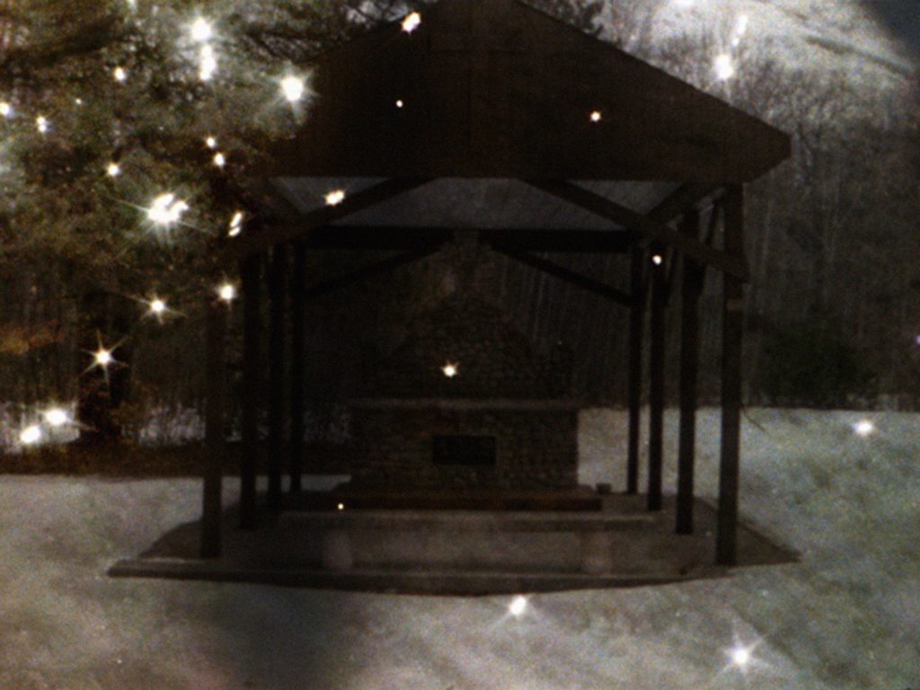 SB: The setting of Spirits in Season is Lily Dale Assembly, New York, the home of the American spiritualist movement. It’s about 135 years old, and now serves as something of a retirement community for spiritualists and psychics. I knew about it for some time, but I’d never been there. In the spring and summer months they host visitors from all over the world, for services at their temple. Contrary to the title, the film was shot in their off-season, in the fall. The sequence of the pet cemetery, which is near the entrance to the Leolyn Woods, was originally going to be brief – but I was so taken with these memorials that I had to shoot a lot of material. As I went further into the woods, I found the Inspiration Stump, which is a tree stump with steps leading up it, with rows of pews lined up in front of it. Services have been held there since 1898. And people leave little objects on it – for example, when I shot there, there was a child’s rubber bracelet on the stump.