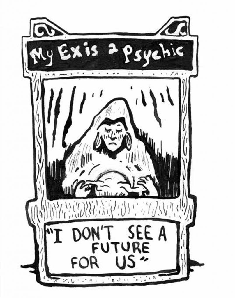 The illustrations and text provided me with an outlet for my heartbreak. I use a fountain pen that often draws from the well of the subconscious. The illustrations hopefully create a bond with the audience by entering into the realm of the symbolic while also directly addressing uncomfortable elements with humour. The handmade nature of text creates further intimacy. Perhaps it is the entertainer in me, but I want to create meaningful work that also affects the reader. I couldn’t imagine this particular book not being hand drawn and hand lettered. It would lose its intimacy. The Canadian Romantic is similar in that it creates a direct communication with the reader, however, with that book I was still playing a character. In this book, the facade is gone, allowing for further intimacy.
