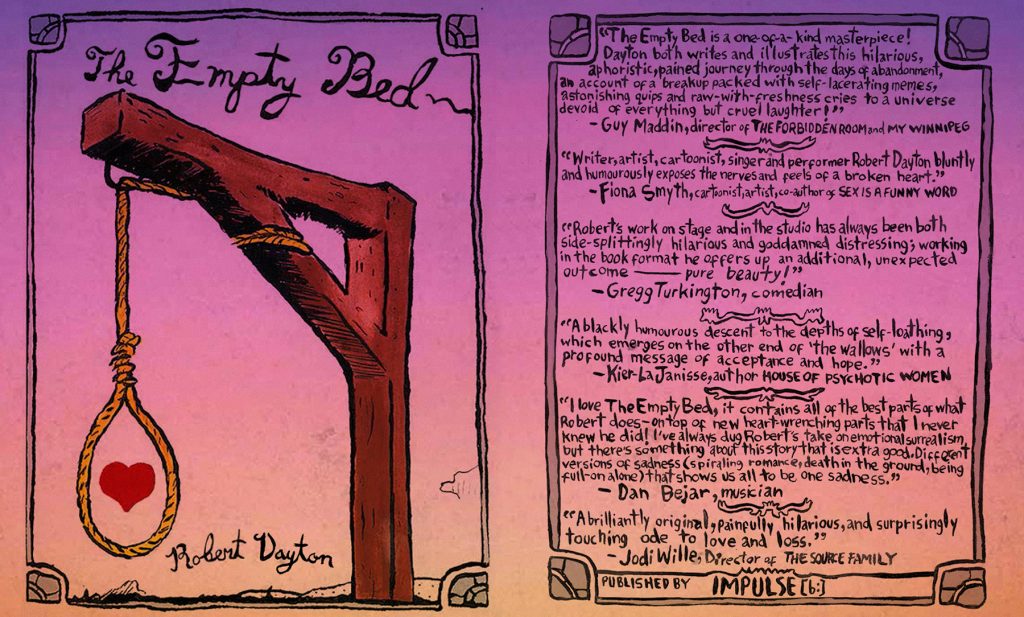 In this interview we discuss Dayton’s practice in relation to The Empty Bed (2017), his newest book published through Toronto’s IMPULSE [b:]. The book is a humorous exploration into the loneliness, self-pity and self-destructive behaviour that occurs due to intense heartbreak and longing that only a genuine romantic could deliver. The following is conversation that took place online and collaboratively edited into its present form.
