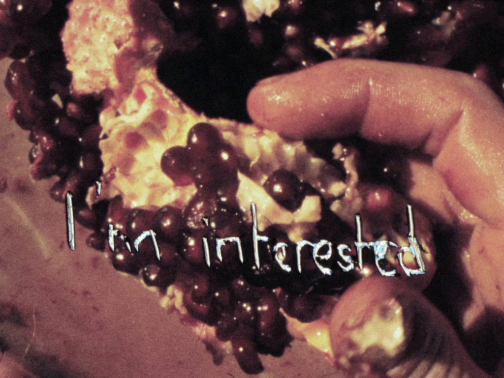 CE: Her Silent Seaming is a handmade film involving written text between two lovers, degraded images from Leafless, the act of putting on make-up, and a pomegranate sensually being put back together. The soundtrack consists of a projector optically reading the image projected 26 frames earlier (or approximately one second earlier), a result of the optical sound mechanics on a 16mm projector. Can you talk about the significance of the title in relation to the film’s content?