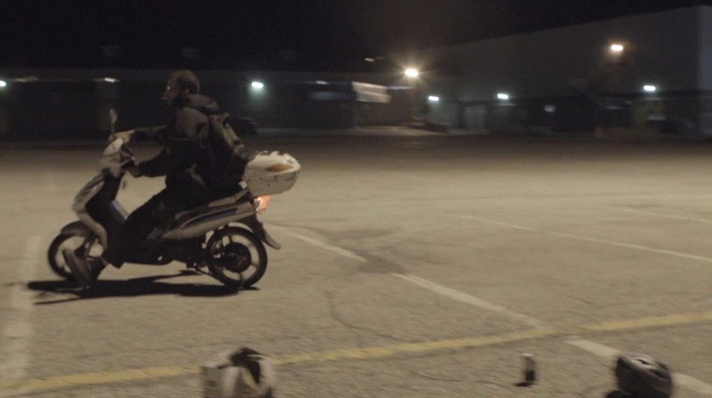 The movie offers us a slice of life in rural Québec, where summer days are spent smoking pot out of home-made water bottle pipes in between river swims, while recreational fishermen offer tall tales. The filmmakers slyly reveal that this isn’t a one-time outing by showing one of the riverside observers holding court in the same posture, on the same lawn chair, on an entirely different day. Later, we are invited to a bar salon, a skidoo show, a DIY garage casino and a parking lot scooter demo. Like the early work of Robert Morin, there is both a self-awareness and a sense of irony, but there is also an intimacy, a familiarity, and a real sense of enjoyment. These frames, this point of view, looks back at its makers, offering us a portrait of someone who would be part of the action even if the camera wasn’t turned on. It is a community portrait made by insiders. Québec folk culture is celebrated throughout the film. In one scene, we are introduced to a landscape dominated by concrete sculptures complete with a castle and two trees groomed to look as though they are figures holding hands. The film also showcases, with much deserved irony and royalty-free rock music, a sport which could only have developed in Québec—Motoneige sur l’eau, that is, skidoo racing on water.