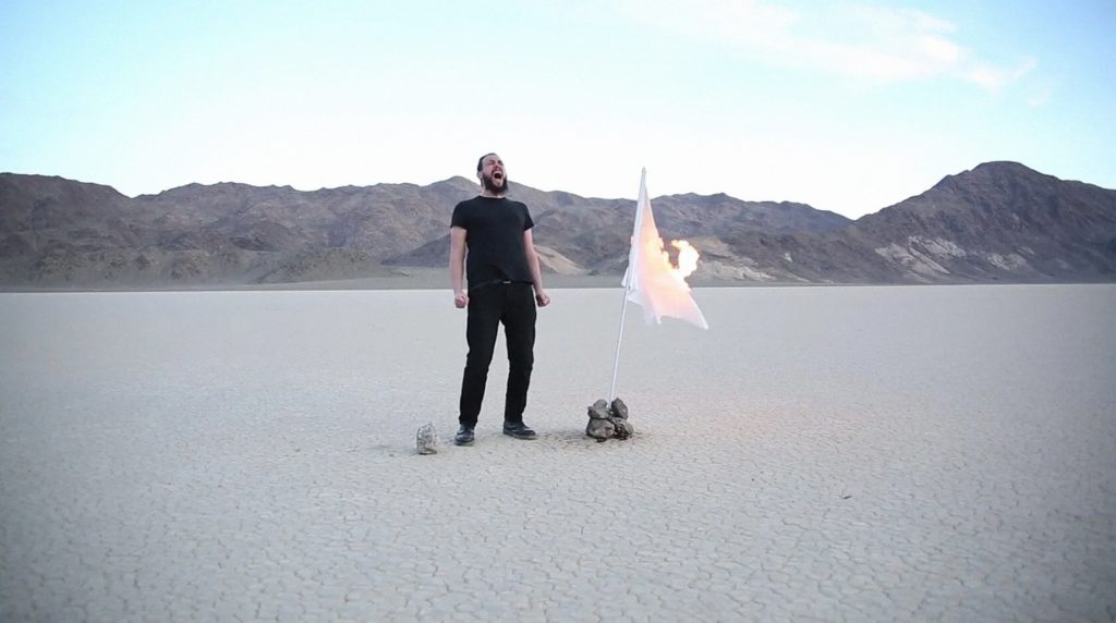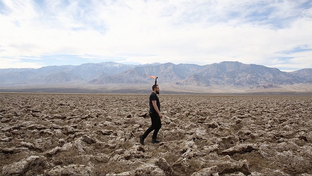 AdlG: It was shot in Death Valley in a place called the Devil’s Golf Course. The rocks there are actually jagged salt crystals which form an intricate system similar to coral. Deep under the surface there is actually water. Walking on them, even without a burning molotov on your head, is difficult at best, which further adds to the tension of the piece. They are also really beautiful. I find desert landscapes incredibly seductive and have used them in other work including Adding Sun (2017), a piece which documents sunlight burnt onto records using a magnifying glass, and Giving myself a reason to scream but not cry (2015-present). All landscapes are political if you look at their history. The landscape is a really well established tradition in art that often has a politic that I don’t necessarily agree with. I see them as a gateway to reach people who may not engage with or who avoid political work. That is, the landscape is a gateway to a more politicized conversation.
